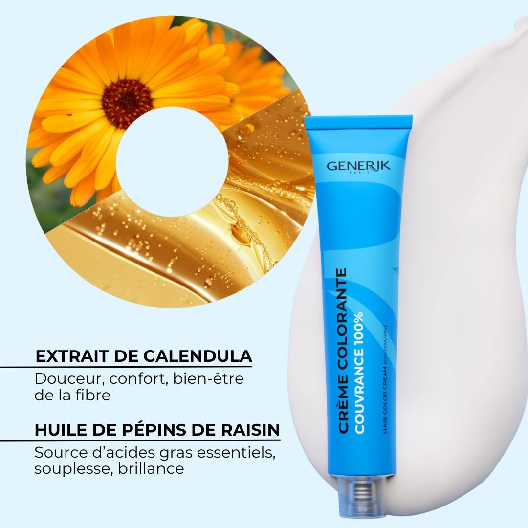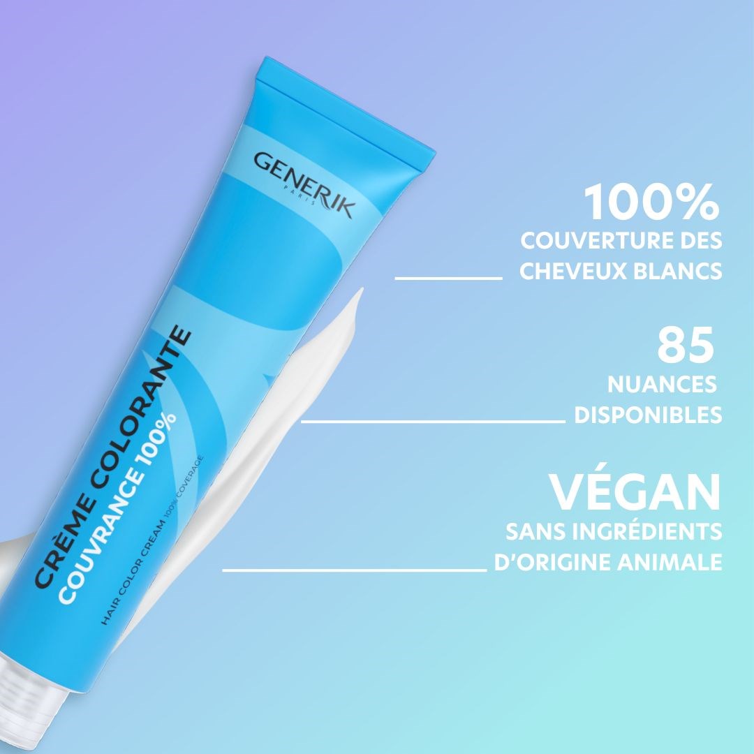 La crème colorante GENERIK est notre best-seller, conçue pour répondre aux exigences du travail en salon. Elle assure une couverture 100 % des cheveux blancs, des couleurs intenses et lumineuses, et une tenue fiable dans le temps.